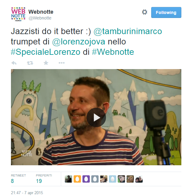 Gli feci un tweet, facendo un fermo immagine mentre andava la diretta di Webnotte, il 7 Aprile scorso a casa di Lorenzo Cherubini a Cortona. Un Tweet in cui volevo sottolineare il contributo di un artista così grande e generoso verso la musica. Questo suo sguardo così gentile mi rimane impresso e penso all’immenso dolore che la sua famiglia sta provando in questo momento. Marco se n’è andato nel tempo di pochi secondi, spero almeno che sia stato un tempo dispari.