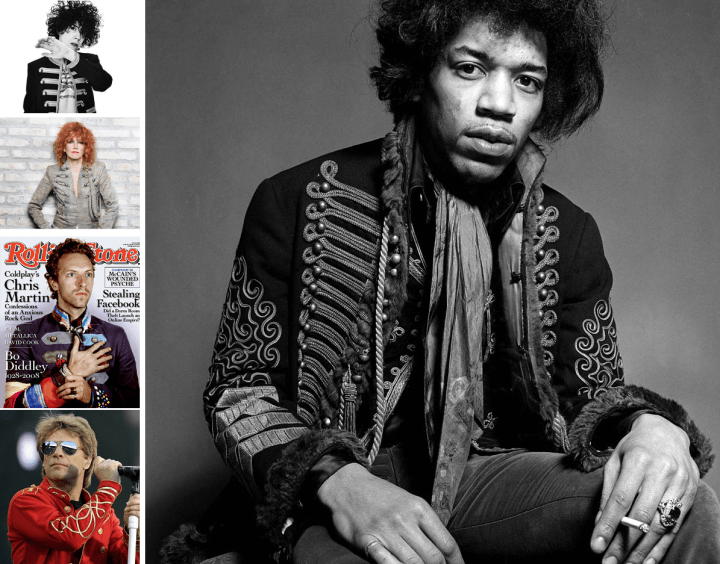 La più famosa delle giacche è pero’ quella indossata da Jimi Hendrix, che ne acquistò una da generale ussaro risalente al 1850. In molte delle fotografie più iconiche, Hendrix indossa proprio quella giacca, a petto nudo e con i capelli selvaggi, regalando un’immagine di se certamente lontana da quella dell’ufficiale della fine del ‘800 che per primo la indossò.