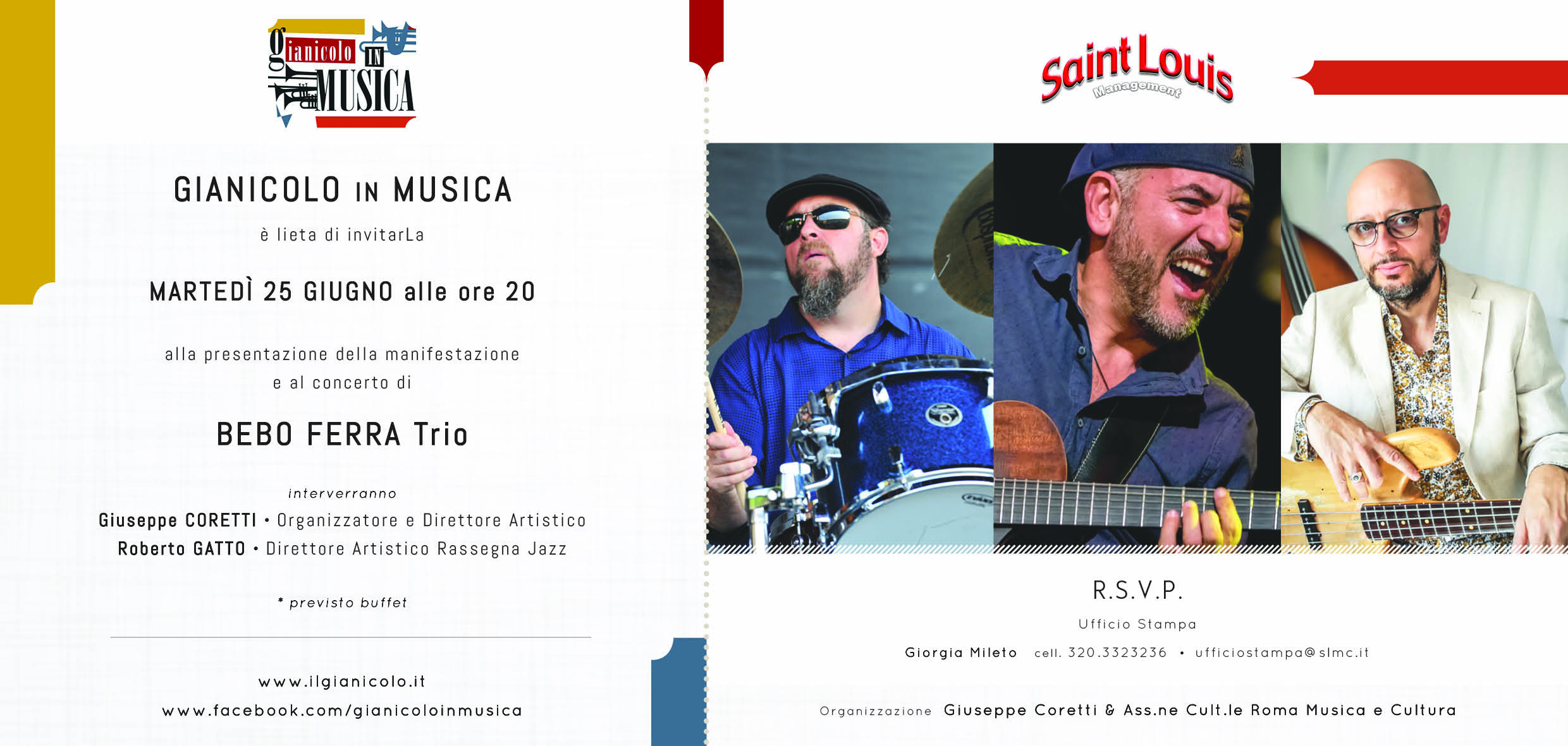 WE LOVE JAZZ! OGGI A Gianicolo In Jazz possiamo goderci il concerto di Bebo Ferra TRIO, nella splendida rassegna dell’Estate Romana dolcemente e comodamente posizionata sulla terrazza più bella di Roma. Con Bebo Ferra considerato ormai da tempo uno dei più rappresentativi chitarristi italiani, troviamo Anthony Pinciotti dinamico, innovativo batterista newyorkese, esperto in jazz, rock e musica mondiale e Dario Deidda musicista a 360°, ma profondo conoscitore del jazz. Va detto… nel jazz è uno dei più importanti rappresentati mondiali del basso elettrico.