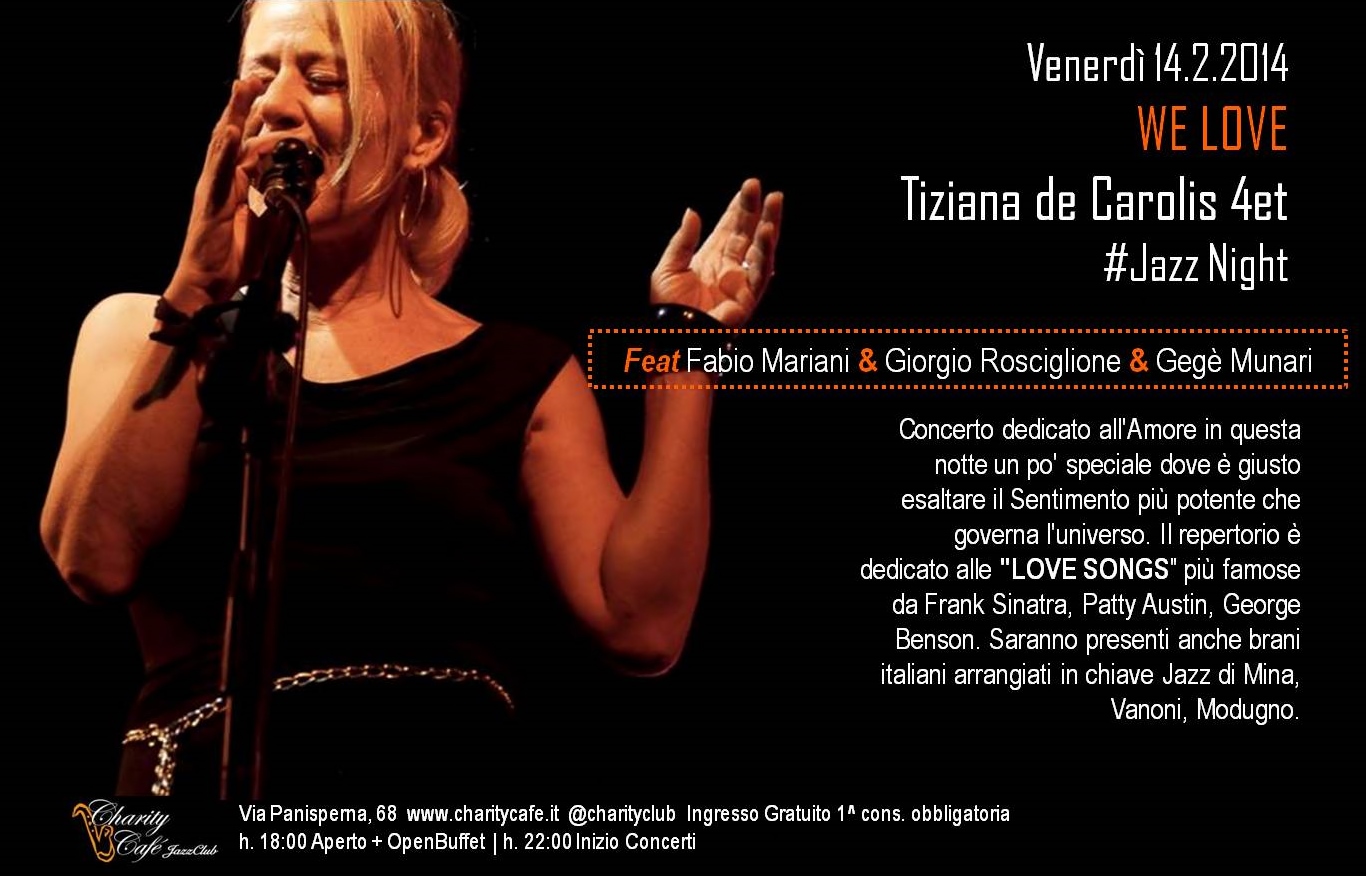 Concerto dedicato all’Amore in questa notte un po’ speciale dove è giusto esaltare il Sentimento più potente che governa l’universo. Il repertorio è dedicato alle “LOVE SONGS” più famose da Frank Sinatra, Patty Austin, George Benson. Saranno presenti anche brani italiani arrangiati in chiave Jazz di Mina, Vanoni, Modugno. Tiziana De Carois dolce e appassionata vocalist romana è la Voce più giusta per questa notte di San Valentino che dedichiamo a tutti gli Innamorati. Ad accompagnarla, ci saranno tre colonne portanti del Jazz Italiano che ci regaleranno momenti di jazz strumentale e affronteranno in Trio alcuni standard.